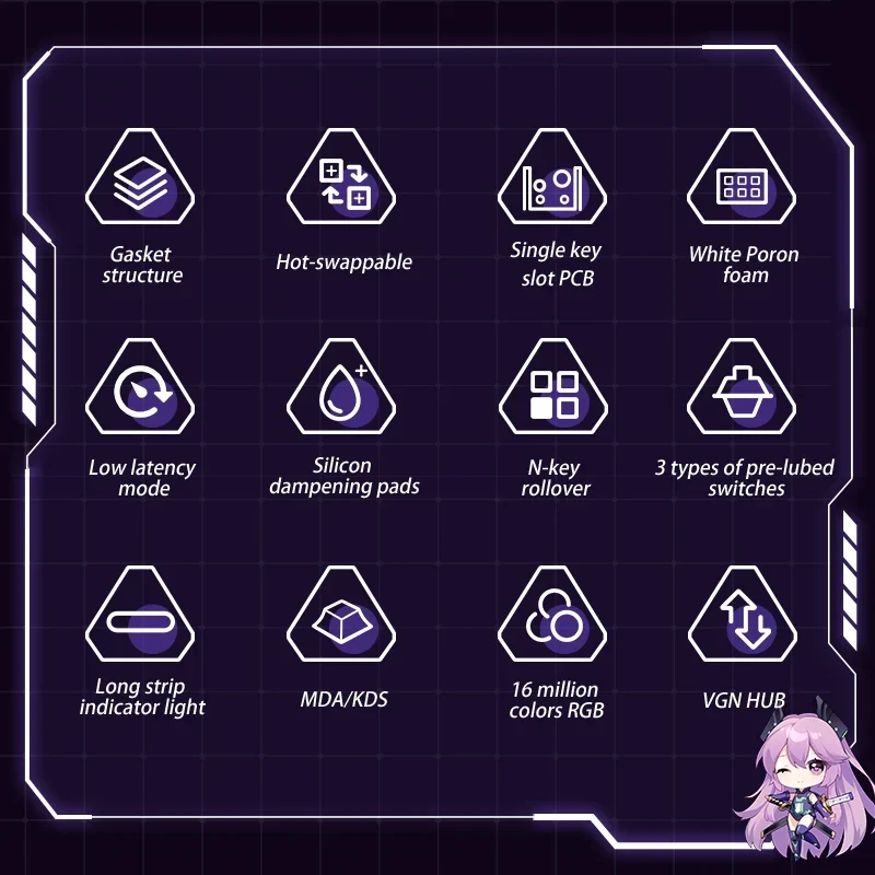 | ДОПЪЛНИТЕЛНИ | 4000 mAh battery Hot-Swappable Switches Gasket Structure Low latency mode Silicone dampening pads Single key slot PCB White Poron foam N-Key rollover 16.8M RGB |